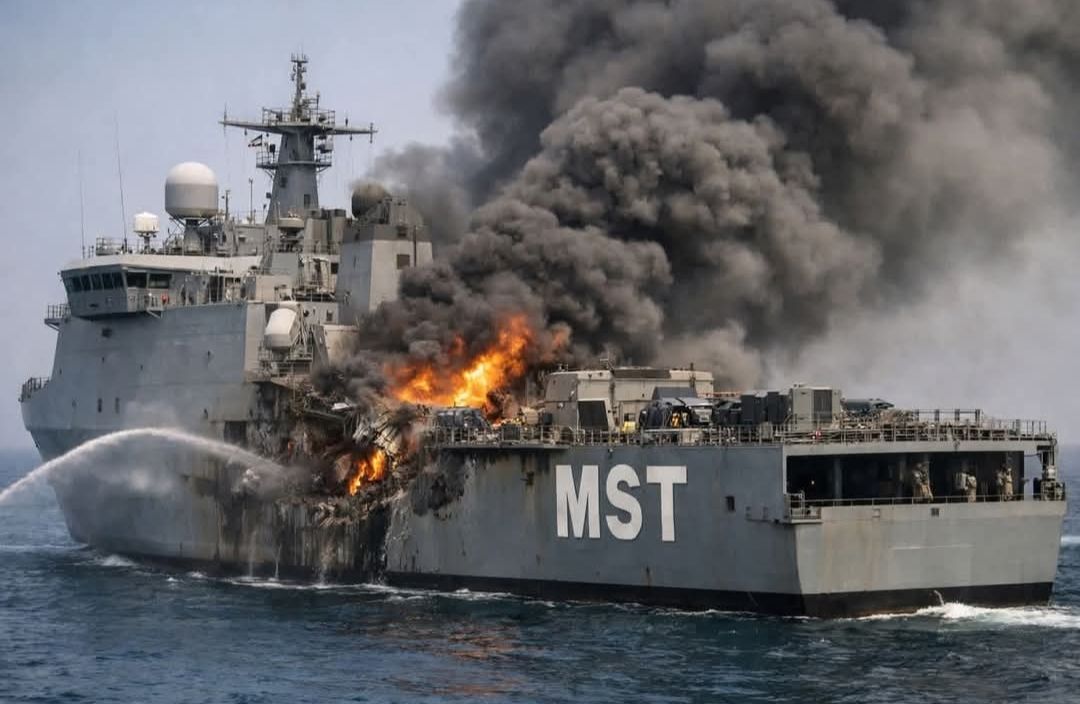 هذه إحدى السفن البحرية الآمريكية للدعم العسكري تشتعل فيها النيران من جراء صواريخ الحرس الثوري الإيراني الباسط فآمريكي وإسرائيل فتحتا على نفسيهما ابواب الجحيم بالهجوم على إيران الدولة المسلمة المسالمة التى لم تهاجم بلدا قط وإنما تدافع عن نفسها إذا تعرضت للهجوم وتنتصر بإذن الله
