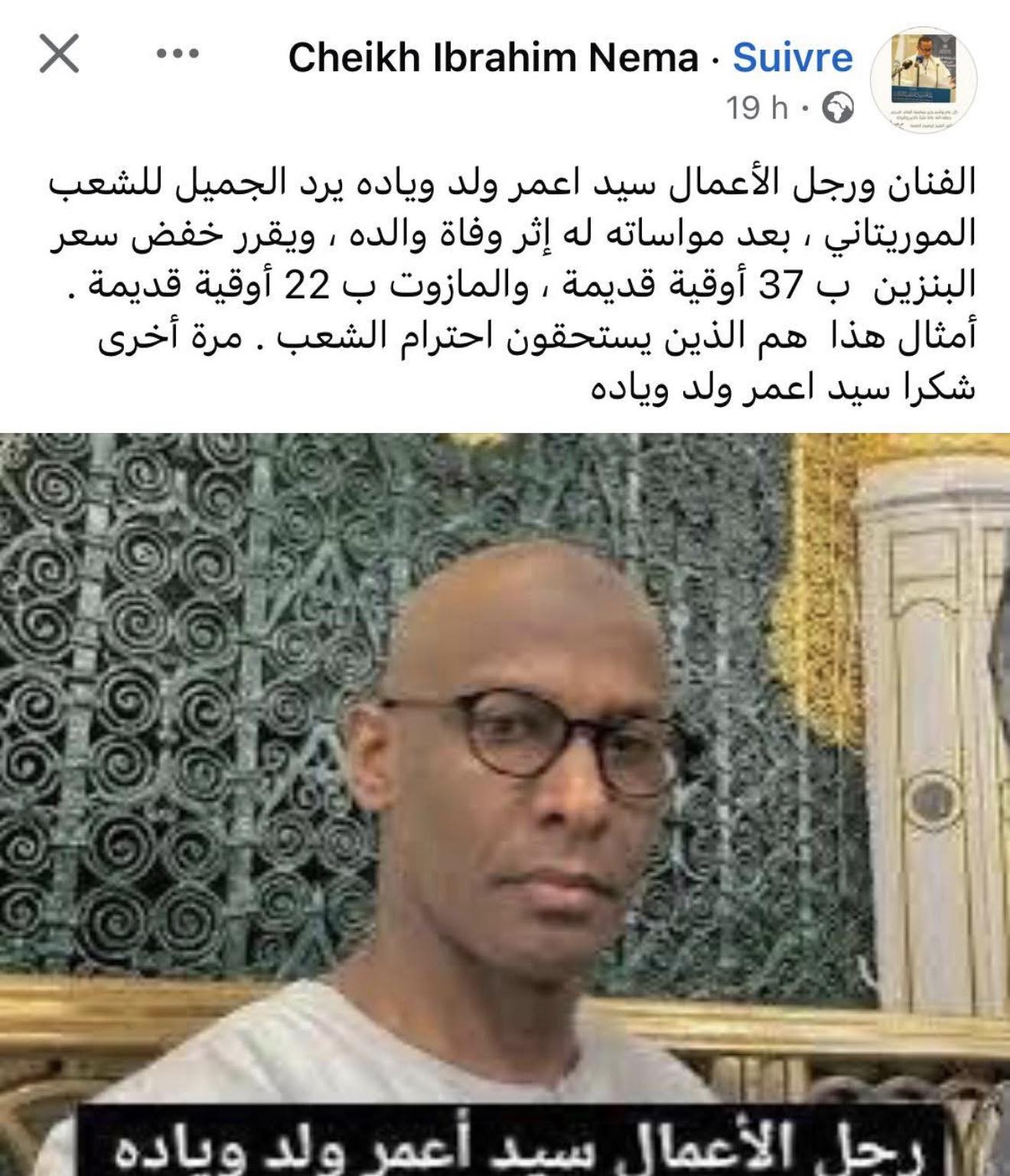 هذا ما نشره المدعوا الشيخ براهيم الناما على صفحته على الفيسبوك حيث كتب قام الفنان سيدعمر ولد ويادة برد الجميل للشعب الموريتاني  بعد مواساته له إثر وفات والده  حيث قرر تخفيض سعر البنزين بسبعة وثلاثين أوقية قديمة والمازوت بإثنين وعشرين أوقية قديمة وعلق على ذلك بالقول أن مثل من يفعل هذا هو الجدير بحب الشعب حسب قوله